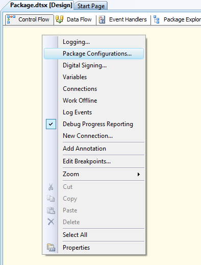 2) right click on the design screen and click Package Configurations